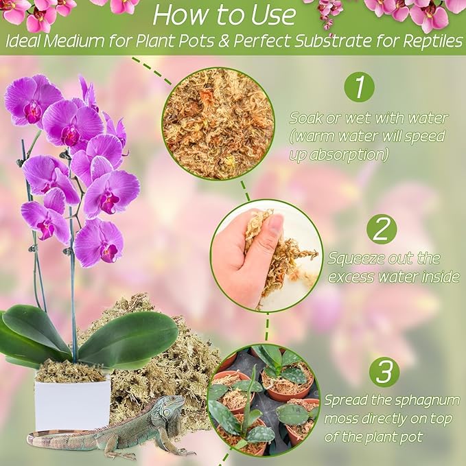 - 🎍【Ideal Medium & Substrate】: The orchid moss sphagnum can be mixed with perlite or potting soil to be used as a ideal growing medium for various plants like carnivorous plant, pitcher plants, venus fly traps, orchid, etc, which not only improves the soil but also provides the plant with the nutrients it needs to grow. It can also be used as substrate for reptile, to reduce pungent odors and provide a healthy living environment for reptiles
