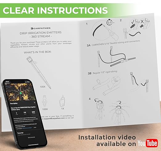 - Be a Gardening Master with the help of our superior and complete Drip Emitters Adjustable 360 Kit: 100 x drip emitters sprayer + 100 x 1/4" Barbed Coupling for easy connection + Bonus 1/4" Mini Hole Punch to drill the 1/2 inch mainline 1 x Complete Instructions Guide Hard Copy + 1 Grow your Own Vegetables Guide full with pieces of advice and practical tips Digital Format + Grow your Own Fruits Guide Digital Format