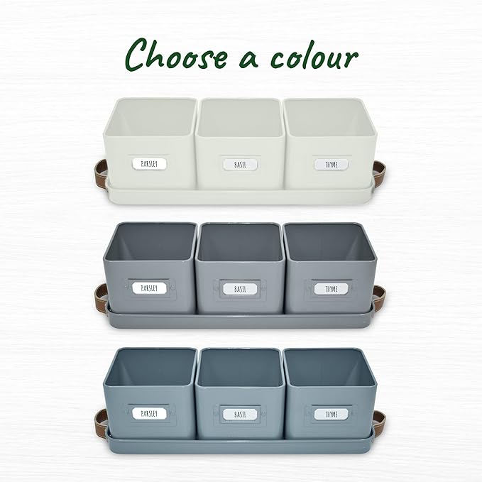 - π» γ Space-Saving γ Enhance your kitchen herb garden with our 3-pack Grey indoor herb pots (4.1" x 4.1" x 3.9"). Includes 5 printed and 5 blank cards for organization, a 4.3" x 13.8" x 1" tray, and pots with drainage holes. Perfect for a lively, fresh-scented windowsill garden.