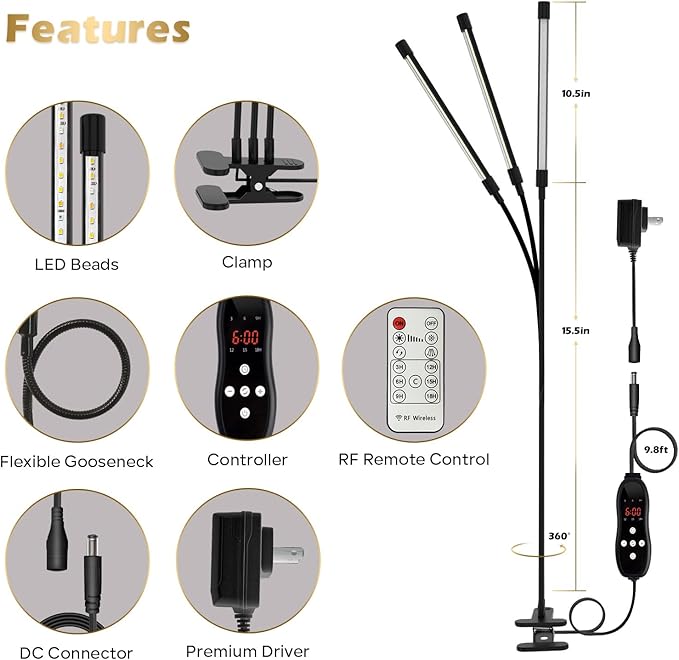 - 【Dual-Control Multi-Functionality】: With a line controller and an RF controller (designed for eye protection, minimizing direct light exposure), it supports 3 color modes, 10-level dimming, 3 independent light controls, and 6 timing presets. Equipped with a flexible gooseneck and robust clamp, this LED plant light lets you fine-tune the light's direction, optimizing indoor plant coverage. Moreover, a professional DC power plug is included to enhance LED power.