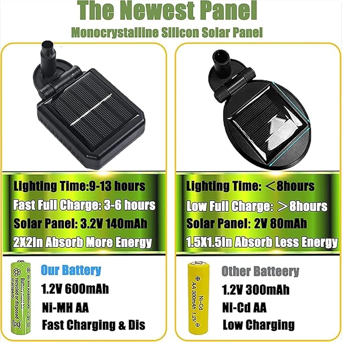 - 【Auto Turn On/Off From Dusk To Dawn】: This solar garden lights solar panels are monocrystalline silicon, and the rest are polycrystalline silicon. The solar light absorbed by monocrystalline silicon is more efficient. Automatic opening at night and automatic closing at dawn, environmental protection and energy saving. The lamp is powered by a 1200mAh rechargeable battery and can be fully charged in 4-6 hours in sunny weather. When fully charged, it can last 8-15 hours at night.