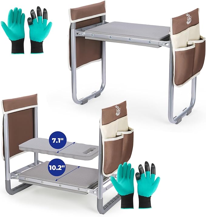 DEERFAMY Garden Stool 10.2" Width, Garden Kneeler and Seat Load Cap 350 lbs, Heavy Duty Gardening Stool with Extra Kneeling Pad, 2 Tool Pouches, Claw Gloves, Gift for Women Seniors, 2 Pack