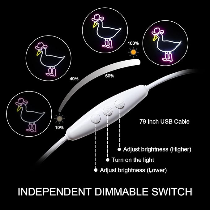 - ADJUSTABLE BRIGHTNESS:The neon light has three buttons, the center button is the control switch button, the upper and lower buttons are used to adjust the brightness of the light, a total of nine levels (10%-100%)