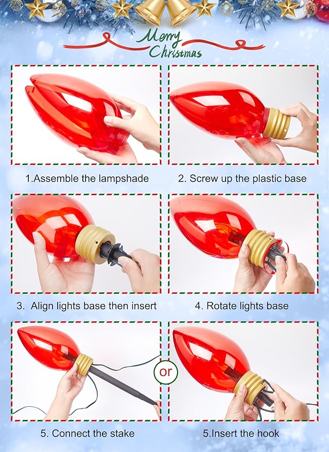 - Easy Replacement: Maintain the longevity of your yard Christmas lights with easy bulb and fuse replacement. To replace a bulb, turn the yard Christmas lights support on the base, pull out the internal light bulb from the outer super jumbo C9 bulb, unscrew the damaged bulb from the holder, and gently screw in a new one. For fuse replacement, slide out the fuse chamber cover, remove the burnt-out fuse, install a new one correctly, and close the cover securely