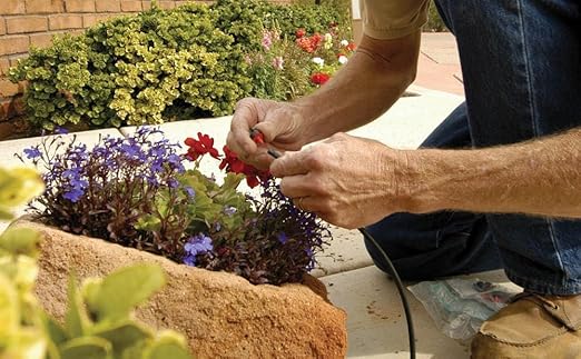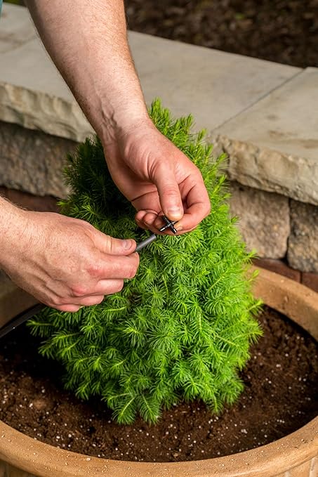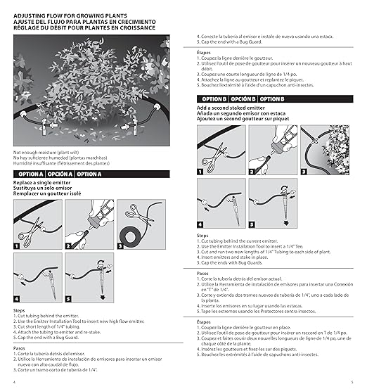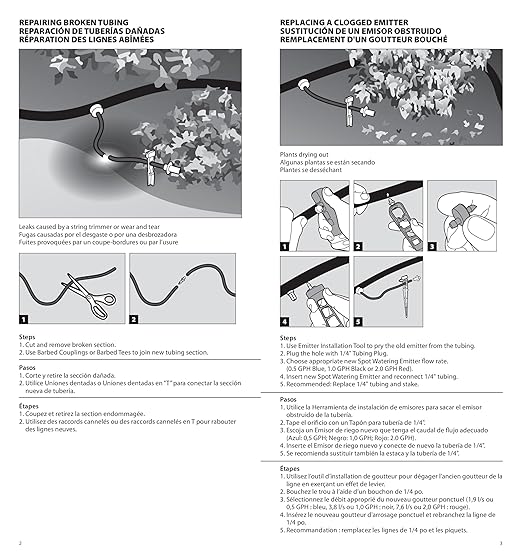 - Components: 100’ of 1/4" distribution tubing, Emitter Install/Removal Tool, Emitters (10) 0.5 GPH, (20) 1.0 GPH, (10) 2.0 GPH, (10) tubing stakes w/bug cap, (20) barbed couplers, (20) barbed tees, (10) tubing plugs, Install guide with tips