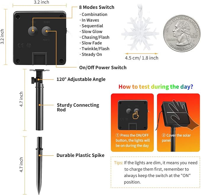 - 🎁【Auto On/Off Management】Featuring a built-in photosensitive component in the solar panel, our Christmas Snowflake lights automatically turn on at dusk and turn off at dawn. No manual operation is required, making it extremely convenient for lighting decor. If you have any questions about our products, please feel free to contact us.