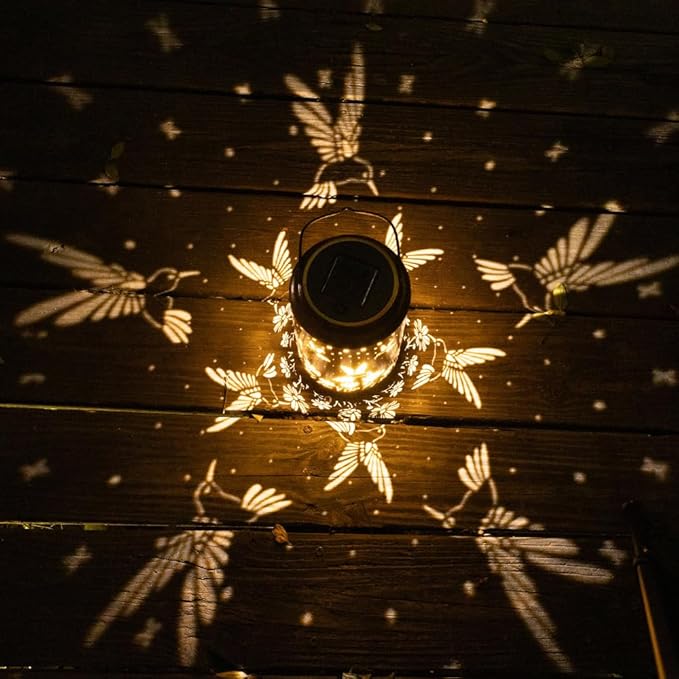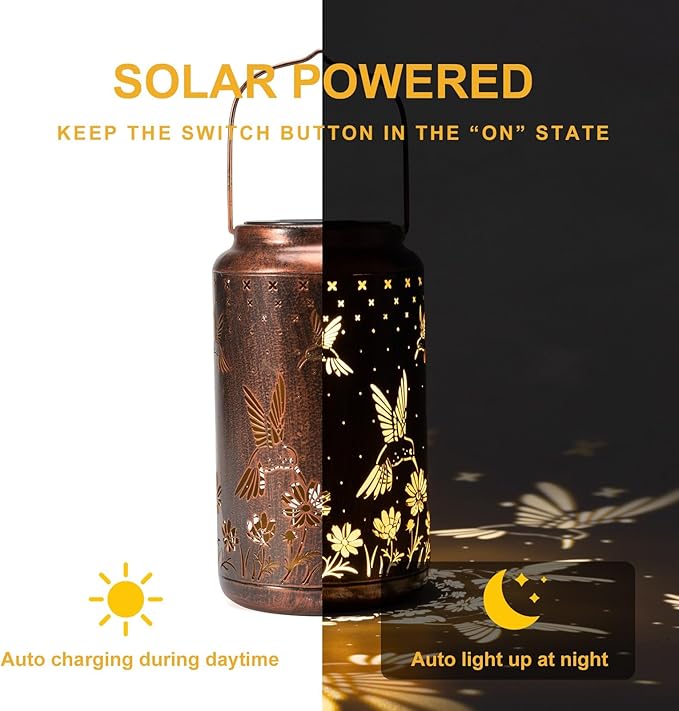 - 【Gorgeous Design】-- The outdoor solar lanterns combines vintage copper and hummingbird patterns. The decorative lantern emits soft golden light at night and displays dynamic and beautiful patterns on the table or ground. It is a gorgeous and unique outdoor garden yard decor.