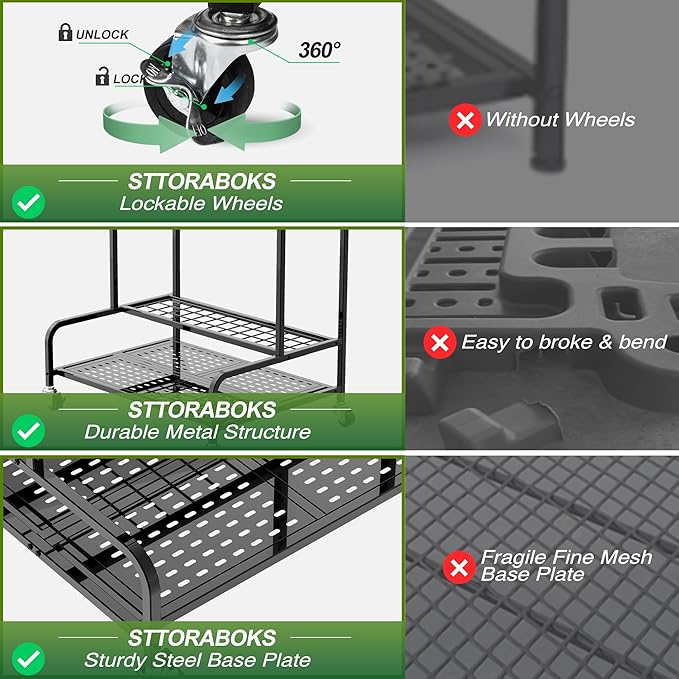 - Durable Construction & Easy to Install: This rolling tool rack is made of durable coated steel, stable and sturdy. You don’t need to worry about it tipping over like plastic tool rack. The base plate is perforated sheet metal, which is stronger than a fine mesh structure. It is rust-resistant and corrosion-resistant, robust enough to endure use both indoor and outdoor. In addition, this garden tool stand comes with screws and wrenches. With the help of instruction, you can install it easily.