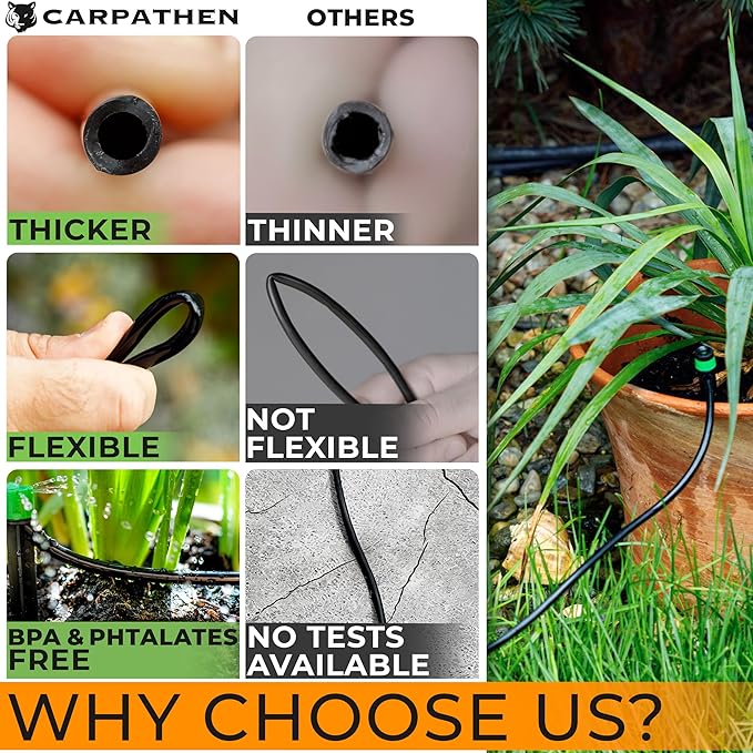 - Spend less, get more - UV resistant and designed for underground or above-ground installation, the Carpathen 1/4 inch drip irrigation tubing will last year-round in any weather. Season after season the distribution tubing will keep your plants hydrated with minimal waste from evaporation. Choose to cut down your water bills