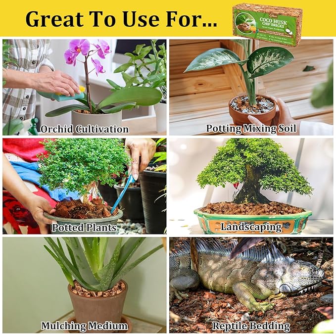- Widely Application: Coconut Husk Chips is a natural soil conditioner and planting medium that you can mix with other potting soil for plant landscaping, orchid cultivation, potted plants, flowers, vegetables, herbs. It can also be used as coco husk chips mulching for indoor and outdoor plants, raised garden beds, as an alternative to bark and other mulches, and you'll love its natural, vibrant colors
