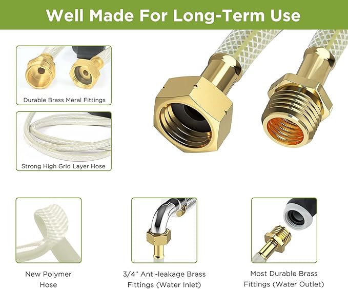 - Heavy Duty Retractable Hose: Our wall-mounted hose reels feature a durable, all-weather flexible hose that's leak-resistant and long-lasting. The 130ft 1/2 inch hose withstands 300 PSI pressure, with solid brass fittings and a thick waterproof ring to prevent rust and corrosion