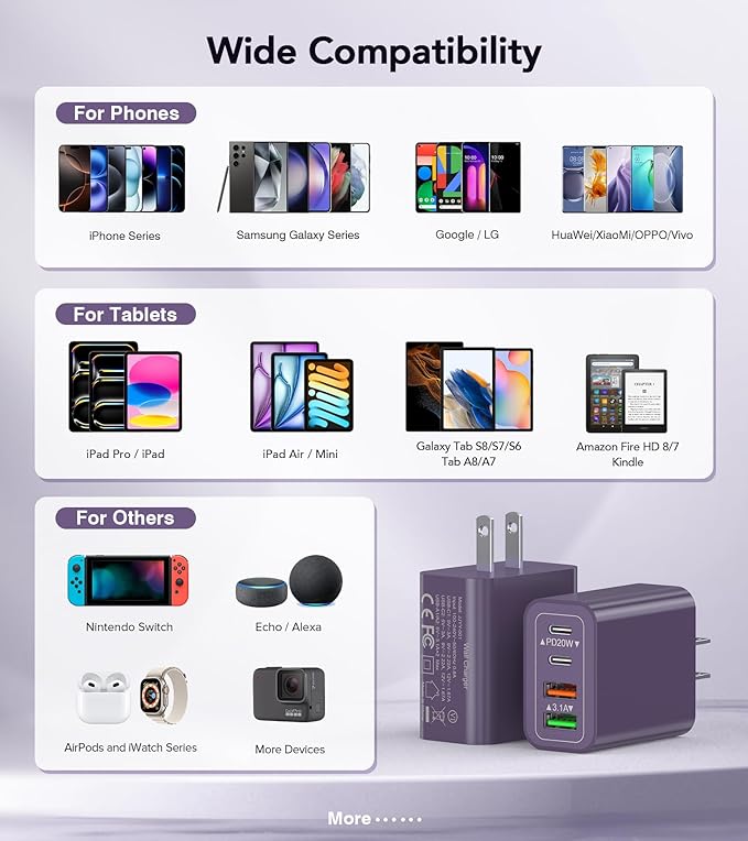 - Universal Compatibility:Due to the special 4-port,the USB charger is compatible with almost all electronic devices,charging adapter for iPhone 16/16 Pro/16 Pro Max/16 Plus/15/15 Pro /15 Pro Max/14/14 Pro/14 Pro Max/13/13 Mini/13 Pro Max/12/12 Pro Max/12 Pro Max/12 Mini/SE 2020/11/11 Pro/11 Pro Max/XR/XS/X/8/7,iPad Air/Pro/Mini,Samsung Galaxy S22/S21/S20/S10/S9/S8/A12/A13/A22/A32/A52/A53/A71/Note 20 10,Tablets,LG,Motorola,Google Pixel and other digital devices compatible