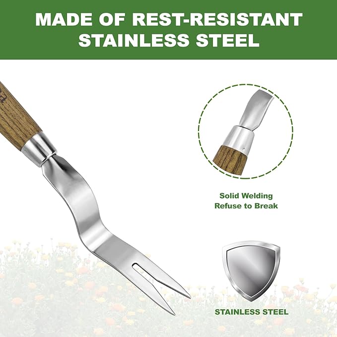 - 【Heavy Duty Metal Resists Bending】This gardening hand weeder tools is made of thicker stainless steel, which has strong compression and corrosion resistance and is more sturdy and durable, meaning it doesn't bend when you get down deep alongside the root to remove Dandelions. Unique seamless welding technology refuses to break.