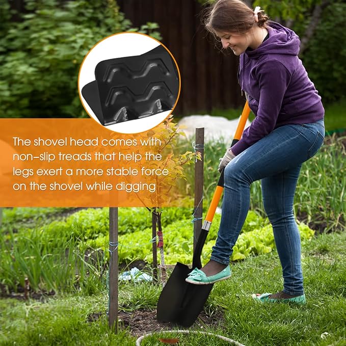 - Professional Design: The larger head of this digging shovel makes digging faster and more efficient, and the metal shovel head comes with non-slip treads that help your feet exert a more consistent force on the shovel when using it for digging.