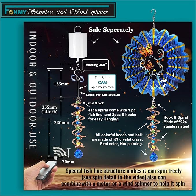 - 【PREMIUM CRYSTAL SUNCATCHER】The spiral with crystal is a special sun catcher rainbow maker, it’s Super Sparkly under sunshine. You can also add a motor(not include) to let the spiral to spin ,while spiral tail rotating (it can’t spin by itself.), the crystal ball seems to move up and down like floating and dancing in air, presents the magical visual illusion.