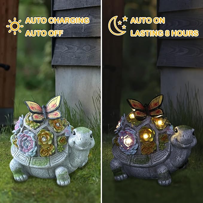 - 【Cute Lawn Decor】Turtle solar statue is a great decoration for garden/ balcony/ patio/ yard/ lawn/ fence/ walkway, the butterfly rests on the turtle will make you smile every time you look at them