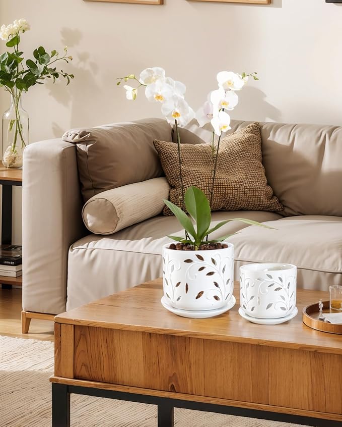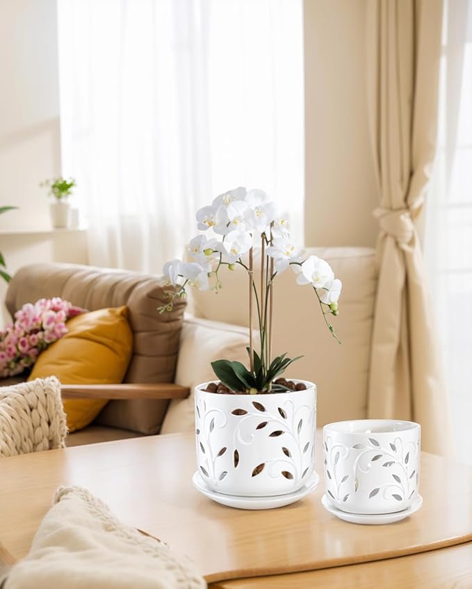 Set of 2 Orchid Pots with Holes & Saucers for Orchid Root Health, 5 inch&6 inch Ceramic Pots for Plants, Effective Drainage and Ventilation to Assist New Plants or Repotting