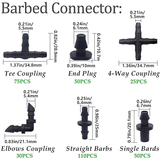 - 100FT Drip Irrigation Kit: The irrigation kits include 1/4" 100FT drip irrigation tubing, 30pcs 1/4" adjustable drip emitters and 340pcs 1/4" drip irrigation barbed connectors