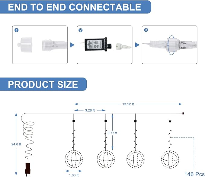 - 【Connectable Globe Lights】 A string of garden globe lights with 4 luminescent balls, each measuring 15.74inches in diameter. Each ball features 136 LED bulbs, with a 3.77ft drop length for each ball and a 3.28ft gap between two balls. These lights can be connected to one another, offering the flexibility to extend up to 3 strands, allowing you to customize your lighting arrangement and festive decorations for a larger area as needed.