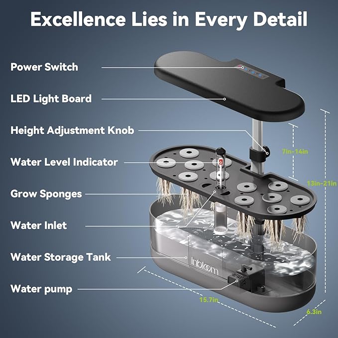 - [Adjustable Lamp Post and Water Level Indicator]: Hydroponics lift-able lamp post can reach heights of 7-12 inches, ensuring 100% light exposure for plants at various growth stages. Suitable for different flowers and plants heights. The water level indicator keeps you informed of remaining water, so you never forget to hydrate your garden.