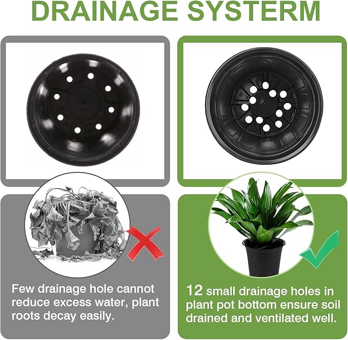 - DRAINAGE SYSTERM- 12 small drainage holes at the bottom of the plastic plant pot allows water to run put, soil remained moist but not waterlogged, helps prevent root rot after watering.