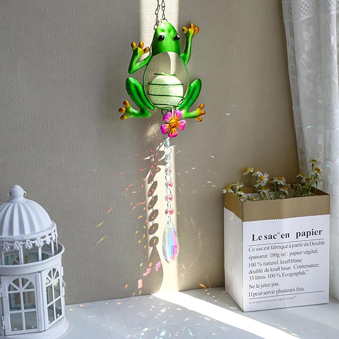 - Eye-Catching Design: The Metal Frog Suncatcher features a unique and intricately designed frog shape, premium quality metal and crystal,containing a fluorescent endothermic shiny ball, it fluoresces at night when the sun shines during the day,creating a delightful focal point wherever it is hung.