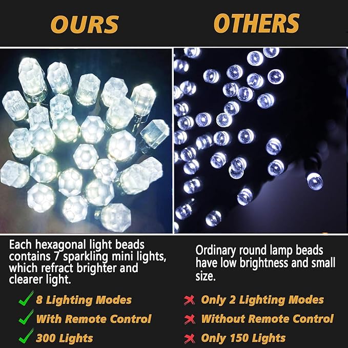 - 💡[Super Bright Diamond-shaped Desigin]:Different from traditional ordinary lamp beads,Our solar christmas lights string adopts diamond-shaped lamp beads.The patented cutting process increases the brightness of the lamp string by more than 5 times.360-degree lighting angle,even at the furthest distance at home you can also clearly see the LED string lights on the window.