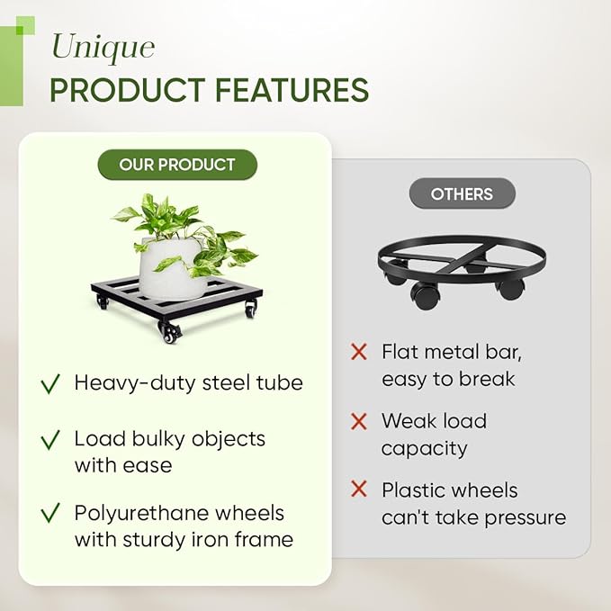 - ELECTROSTATIC SPRAY POWDER COATED: The rustproof, water resilient, and weather resistant matte coated makes the plant roller base more durable under any prolonged exposure to harsh environmental conditions. Our rolling plant caddy also reduces waste due to the modern electrostatic spraying technology.