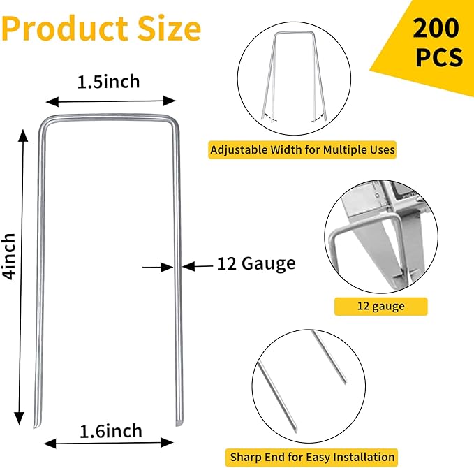 CEWOR 200 Pack Landscape Staples 4 Inches, Galvanized Metal Garden Stakes Landscaping Landscape Fabric Staples Sod Pins for Lawn, Barrier Fabric, Garden Fence, Ground Cover