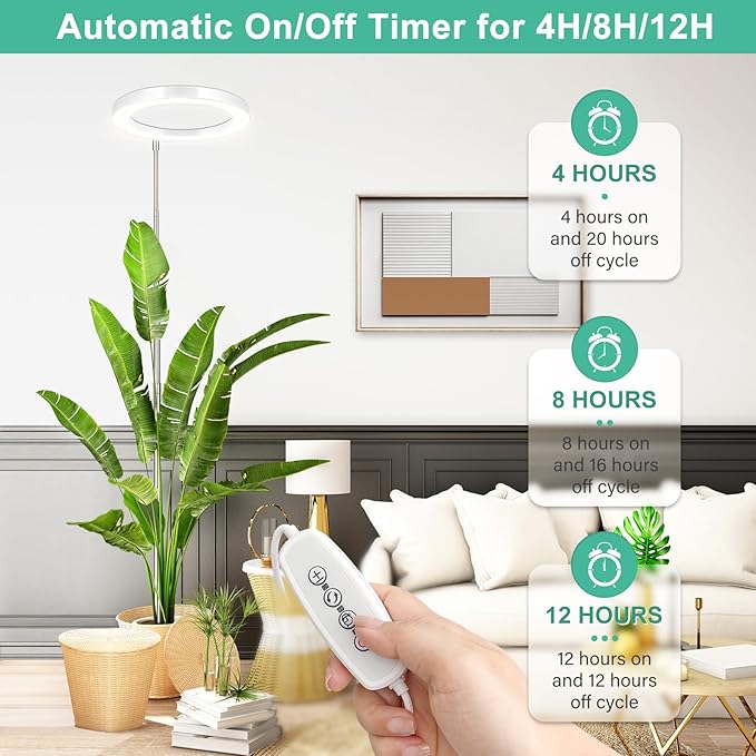 - Auto On/Off Timer and 10 Dimming Levels: Take control of your plants' lighting needs with easy-to-set timed dimming functions. Select from 4, 8, or 12-hour cycles, and the light will automatically turn on/off at your pre-set times. With 10 adjustable brightness levels(10% to a powerful 100%), you have precise control over the lighting intensity.