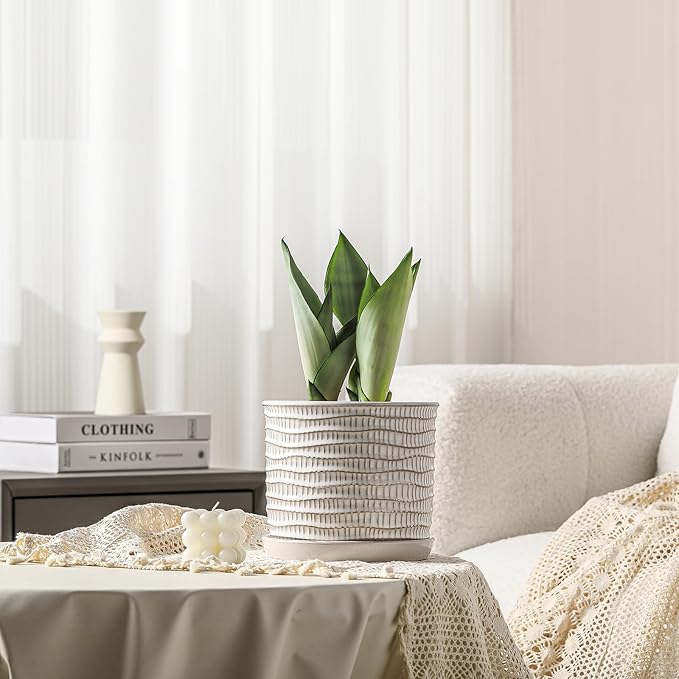 8 Inch Plant Pot: Ceramic Planter with Drainage Hole & Saucer - Cream White Flowerpot for Indoor & Outdoor Plants - with Separate Tray for Home & Office - Wave Embossed Design