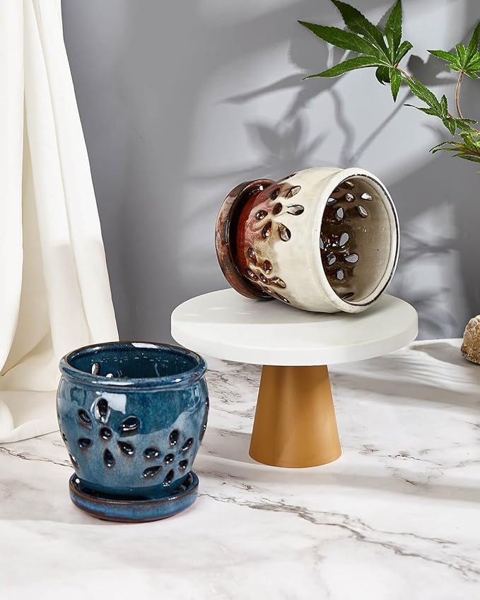 vensovo 4 Inch Ceramic Orchid Pots with Holes and Saucers - 2 Pcs Small Succulent Pot for Repotting, Garden Flowerpots for Plants Indoor and Outdoor Promotes Air Circulation (Blue, Brown Mixed)