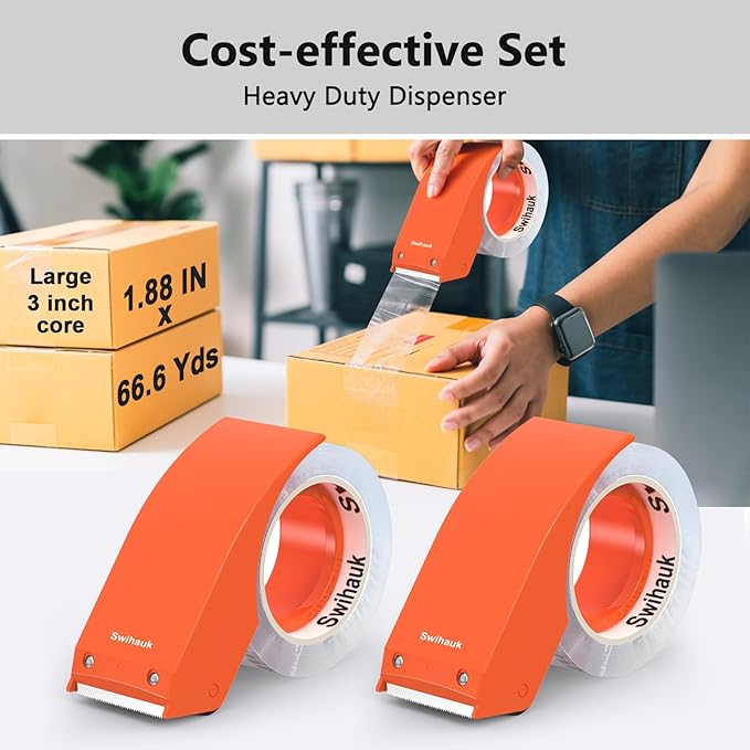 - 【Effortless Application】: Paired with a inovative dispenser which features a small rolling shaft to prevent the tape from falling back, Swihauk packaging tape with dispenser makes it a breeze to get your packing acctivities done quickly and efficiently.