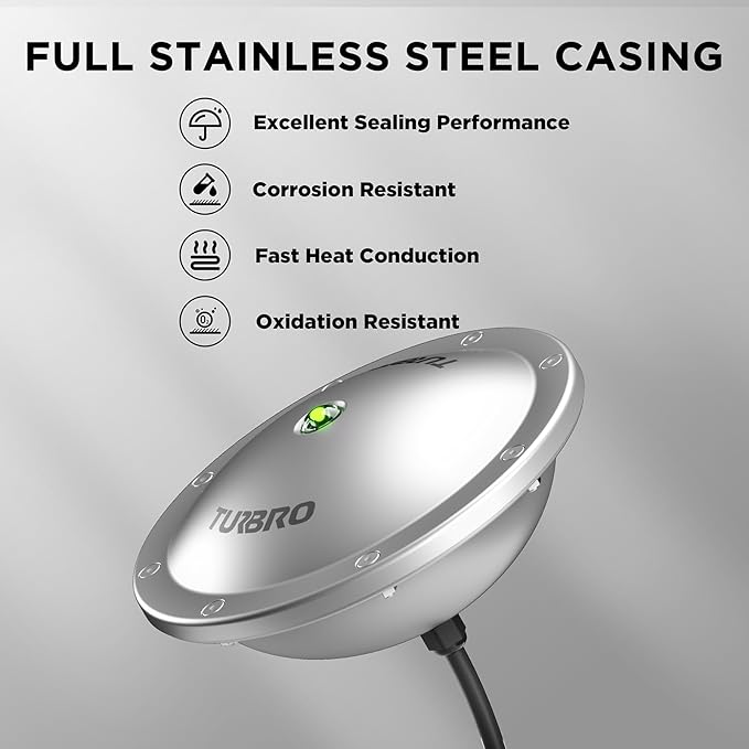 - 🐟Extended Power Cord: Benefit from the flexibility of placement with TURBRO's pond de-icer, thanks to its generous 32.8ft power cord. Reach further to meet your specific needs with ease.
