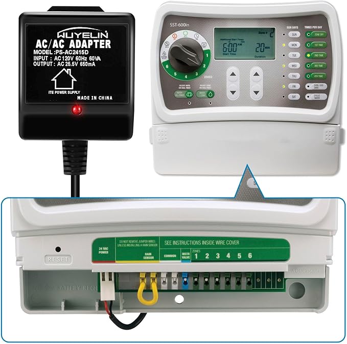 - POWER :It is a replacement transformer for SST series indoor irrigation timers. Input volatage is 120VAC 60Hz; Output rating is AC25.5V / 650mA. COMPABILITY:Compatible with the following indoor timer/controller models: SST400I, SST400IN, SST600I, SST600IN, SST900I, AND SST900IN.Perfectly work with 24VAC Irrigation indoor timer for most of market brand.