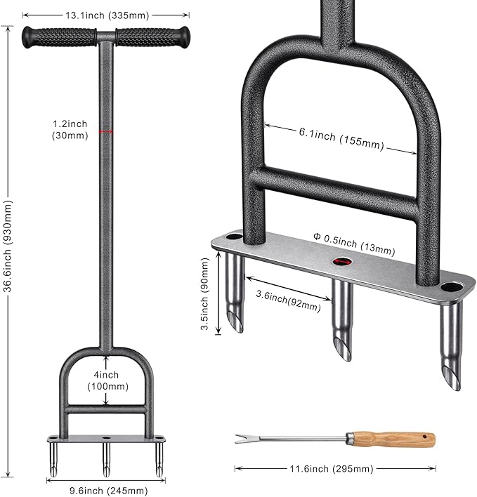 - Come with 12‘’ Weeder Handle Tool: Use this lawn coring aerator for other gardening tasks, Lawn aerators come with a 12’’ hand tool that you could use to clean the aerator. It can also be used for transplanting seedlings and weeding, which is very convenient.