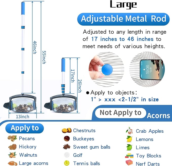 - 🏆【Widely Used】This one capacity is1.5 gallons. This one nut gatherer can picks up objects 1’’ To 2-1/2’’ in sizes such as chestnuts, walnuts, pinecone, buckeyes, hickory nuts, nerf balls, golf balls, and even some small fruits such as lemons, limes, crab apple and more. Note: this one can't pick up acorns&sweet gum balls.