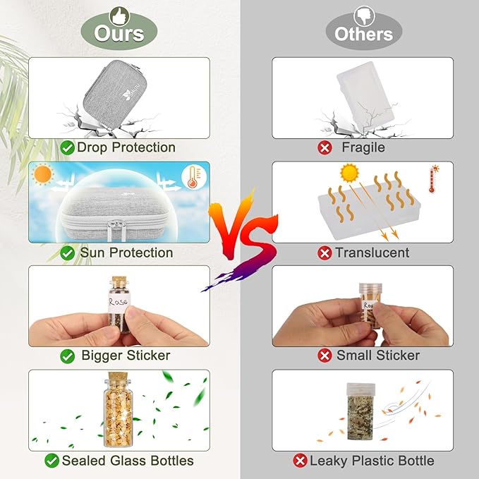 - [Upgraded Protection for Your Seed]: SMUJU seed storage organizer using a combination of small glass bottles with corks and wooden corks,which can ensure that the seeds are protected from water vapor and sunlight, preventing oxidation and spoilage of the seeds, thereby increasing the survival rate and germination rate of the seeds. Compared to other plastic bottle, SMUJU glass seed storage bottles are more sturdy and more sealed.(Seeds Not Included)