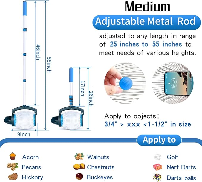 - 🏆【Widely Used】This one capacity is1 gallon. This one nut gatherer picks up objects ¾” To 1 1/2” in sizes such as Acorns, chestnuts, walnuts, pecans, butternuts, buckeyes, hickory nuts, nerf balls, golf balls and more.