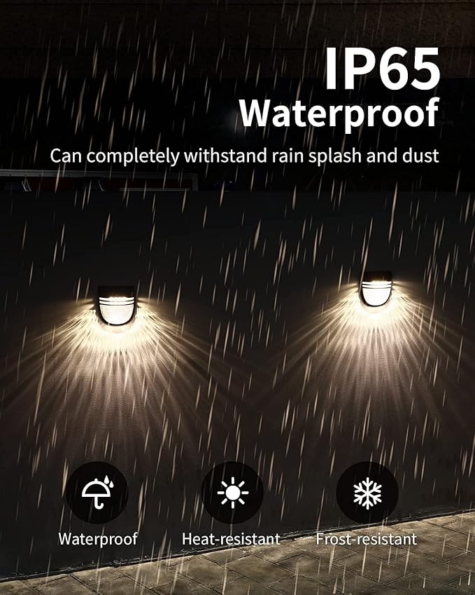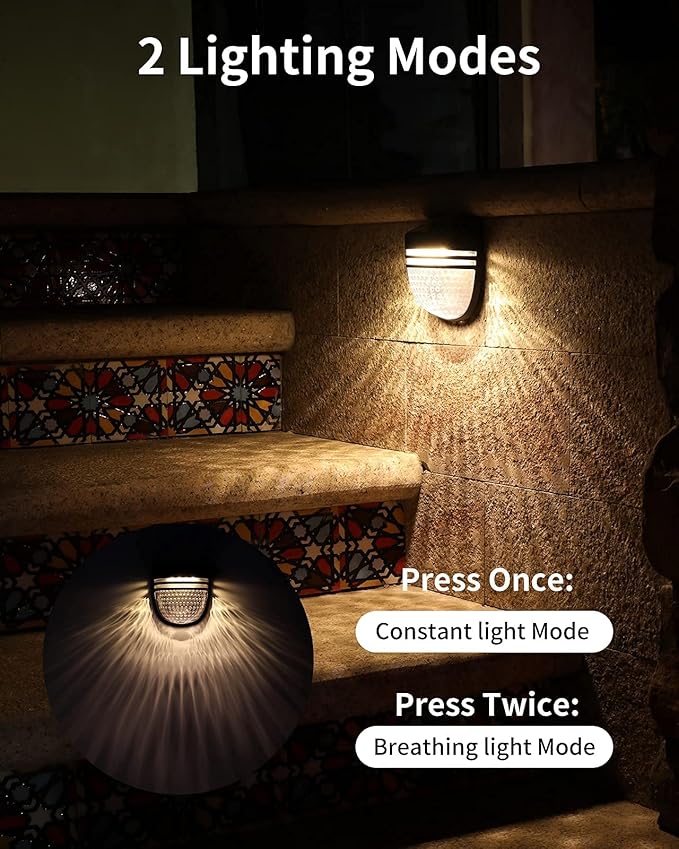 - [Two Modes and Day Night Sensors] Our outdoor solar fence light can choose between normal warm light mode or progressive breathing mode by switching the button located on the back of the solar fence light. It will fully absorb sunlight and automatically light up your house at night, bringing you warmth and comfort, no longer being shrouded in darkness.