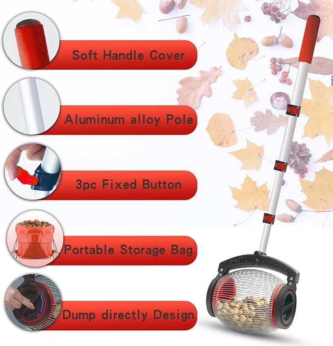 - 🏆【Which Features are better Others】①Telescopic rod with 3pc fixed button to fix height will be tighter, adjust high which perfectly matches people with different heights. ②Spherical basket connecting shaft widened - better scroll. ③Dump Outlet medial is designed slope - better Dump. ④Comfortable soft handle cover. ⑤A storage bag, you can use to store the collected nuts. ⑥Exquisite Gift box packaging can be given as a gift.