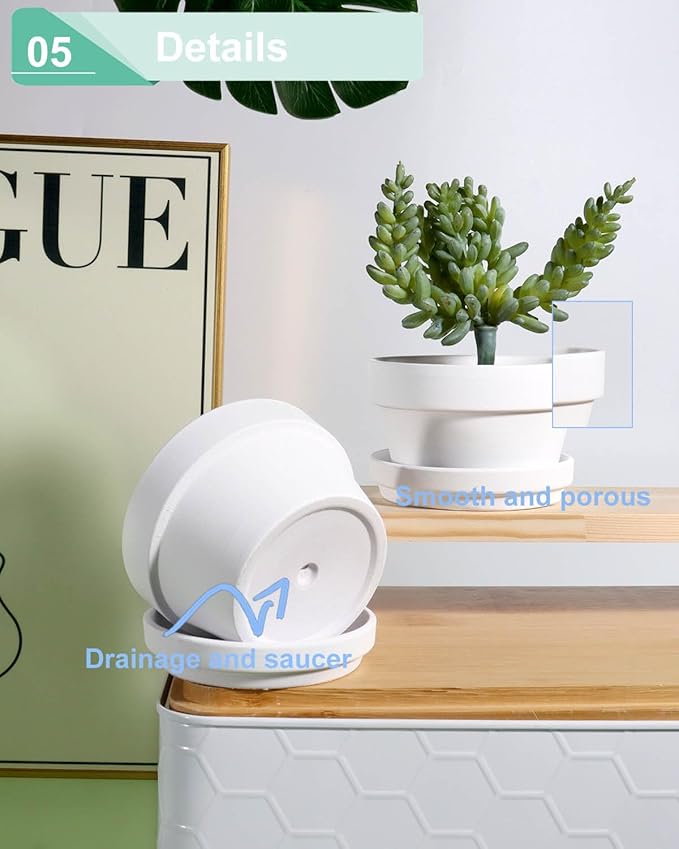 - Saucer&Drainage: Package included 6pcs terra cotta saucer to prevent dust and water from falling out of the drain, to keep the interior clean and to increase the beauty of the room the drainage outlet can prevent water accumulation and extend the life of the plant.