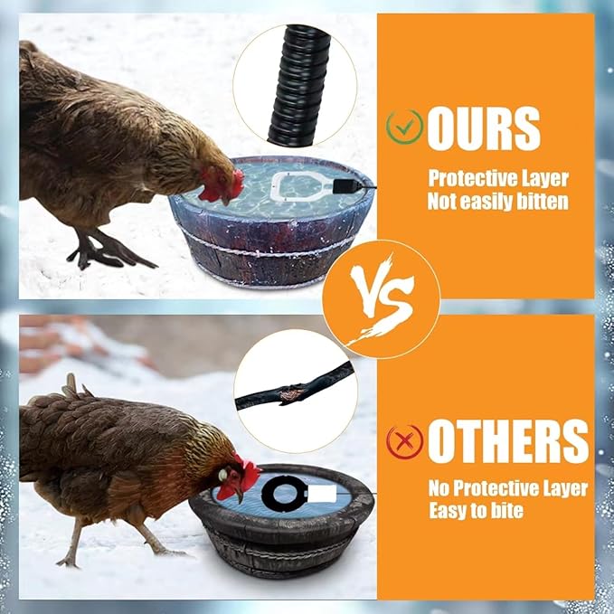 - ENHANCED SAFETY FEATURES - With our newly upgraded bird bath heater, we have added a unique design of a protective cover for the power cord. It effectively prevents poultry or animals from chewing and does not conduct electricity. The de-icer can touch the metal part during the working process, safe and reliable!