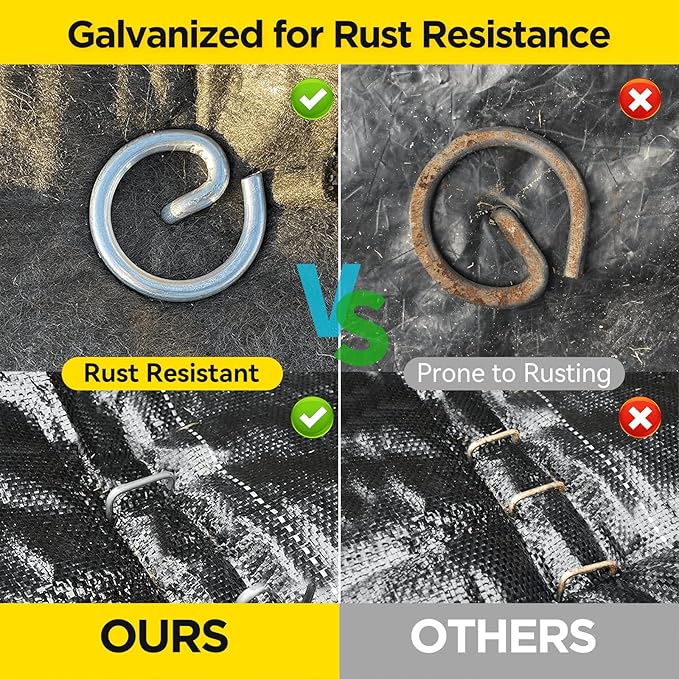 - THICKER 8 GAUGE, LONGER 8 INCH GALVANIZED PINS: Our Weed Barrier Staples are built with robust 8 Gauge thickness, 30% thicker than standard 11 Gauge pins. This extra strength resists bending, especially in tough or rocky soils. With a longer 8 inch length, they provide deep anchoring for a secure hold. For superior wind resistance, opt for the 8 inch pins over the regular 6 inch ones.
