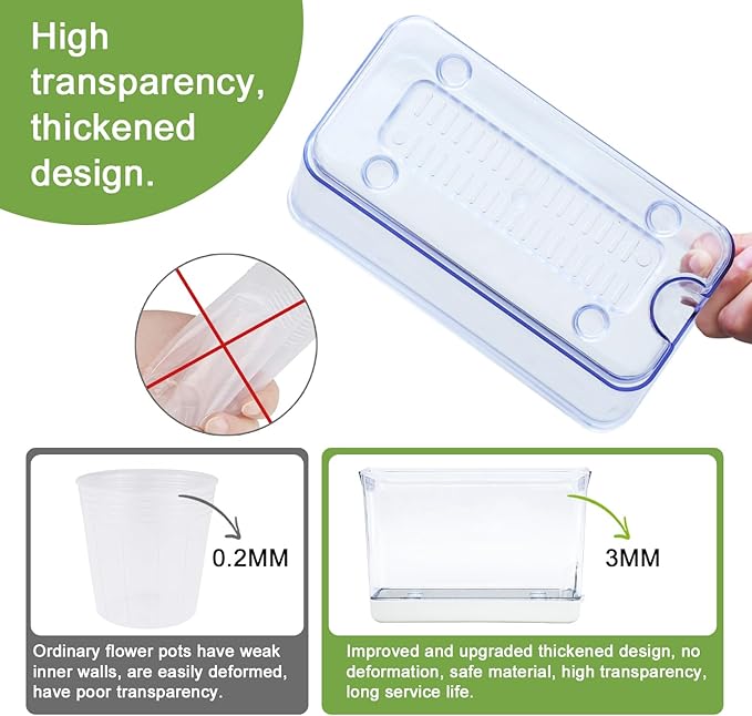 - 𓍄𓍄The double-layer design allows excess water to be stored at the bottom of this plant pots. Water is separated from liner, only absorbed by cotton. This pot is made of high-definition transparent material, There is a special water injection port for easy water injection and maintain air circulation.