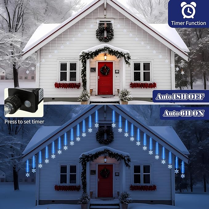 - Stunning Meteor Shower Snowflake Effect: create a mesmerizing atmosphere with our 480 LED Christmas meteor shower snowflake lights; With a good snowflake design, each of the LED lights will light up and down one by one in sequence and quickly, emitting blue light, like realistic meteor showers or snow at night; The cascading snowfall effect will add a touch of magic to your Christmas decorations