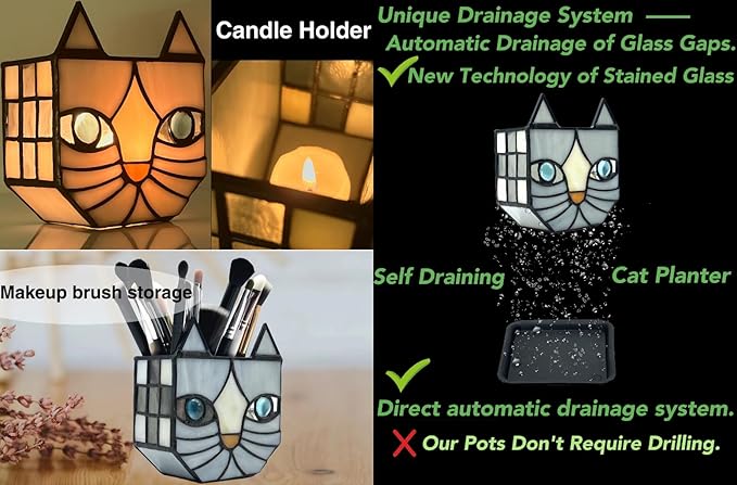 - Looking for a unique and beautiful way to display your plants;Tiffany's Adorable Cat Stained Glass Planter; Made with a corrosion resistant pure copper frame, these pots are not only functional but also beautiful. Each flower pot is handcrafted and can be used for planting, dried flower arrangement, candle holder, pen or cosmetic brush holder and so on. Perfect for decorating your dining table, living room, or anywhere else you want to add whimsy and charm