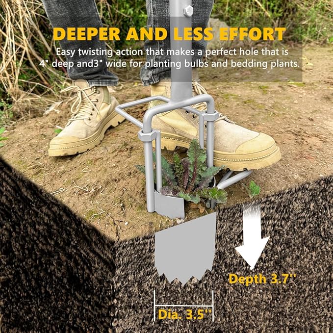 - 【SIMPLE AND EASY TO USE】 –To use, drive the Long-Handled Bulb Planter into the soil Step down the edge pedal, you can control how deeply into the dirt. and turn clock-wise and counter-clockwise a few times to loosen up the dirt, then pull up. Dig 3.5inch diameter planting holes quickly, Step down the middle pedal effortlessly release your soil.one after another, from a comfortable standing position. Avoid digging in dry or overly saturated soil.