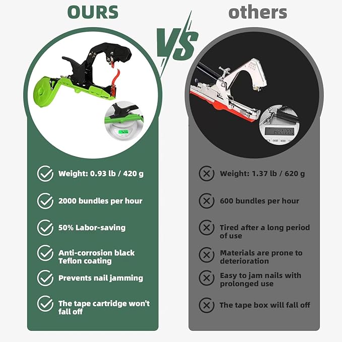 - Precision & User-Friendly: Our garden binding tapener features a high-precision, visible staple slot and our no-disassembly needle design, enhancing operational convenience. Additionally, the secure tape box won't fall off