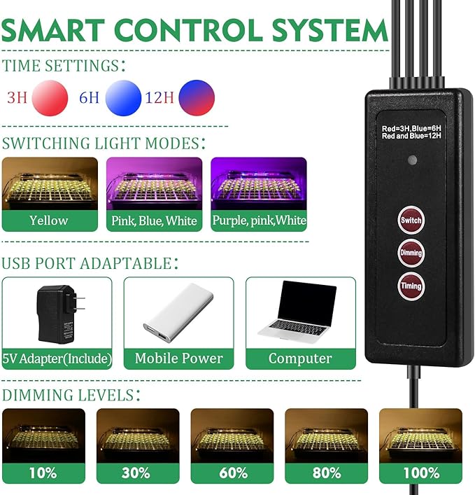 - [Smart Control System ] Designed after professional evaluation, each plant light consists of 9 red light beads, 7 yellow light beads, and 4 white light beads. Our seeding starter tray comes with a multi-functional grow control light. 3 light modes, 5 brightness levels, 3 timing modes: Red light on the controller is 3 hours, blue light is 6 hours, and red & blue light is 12 hours. This light regulator allows you to customize different light intensities for different plant growth stages.
